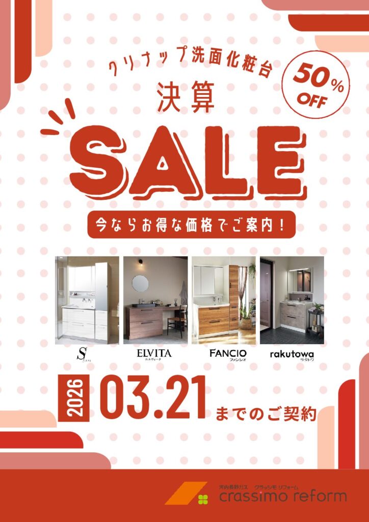ホーム > お知らせ > クリナップ洗面化粧台 決算SALE開催中!