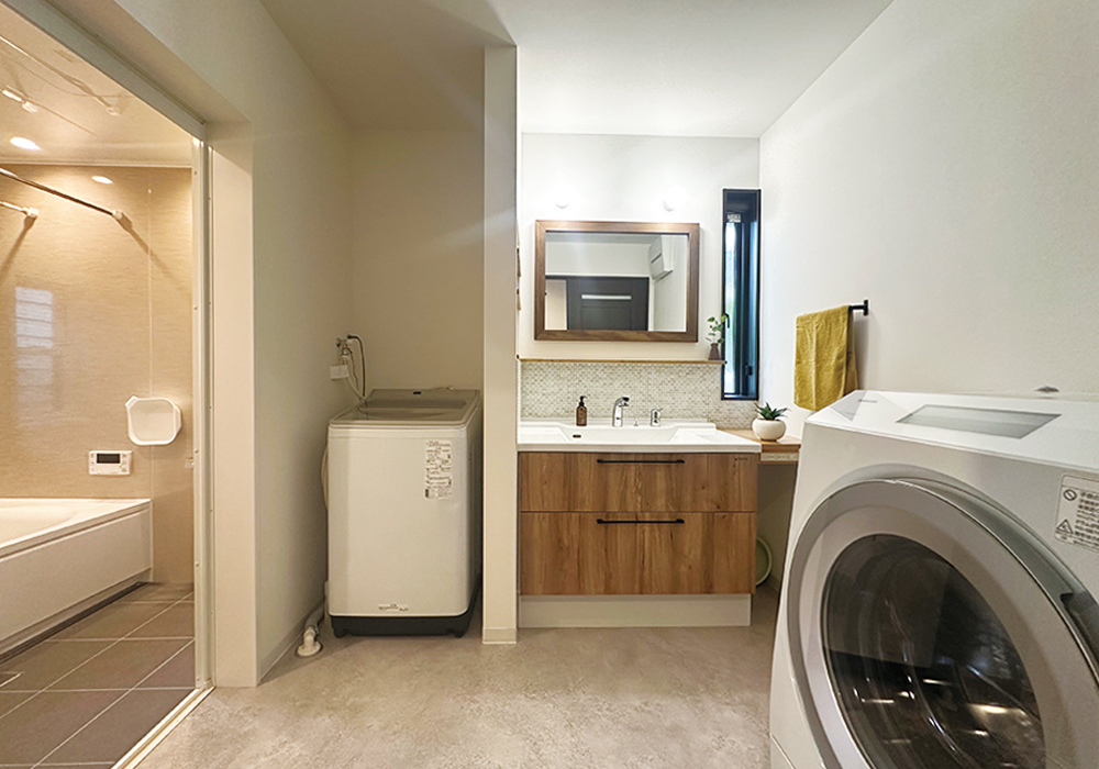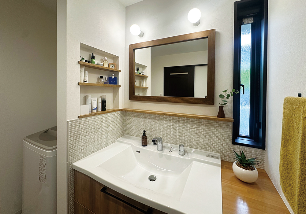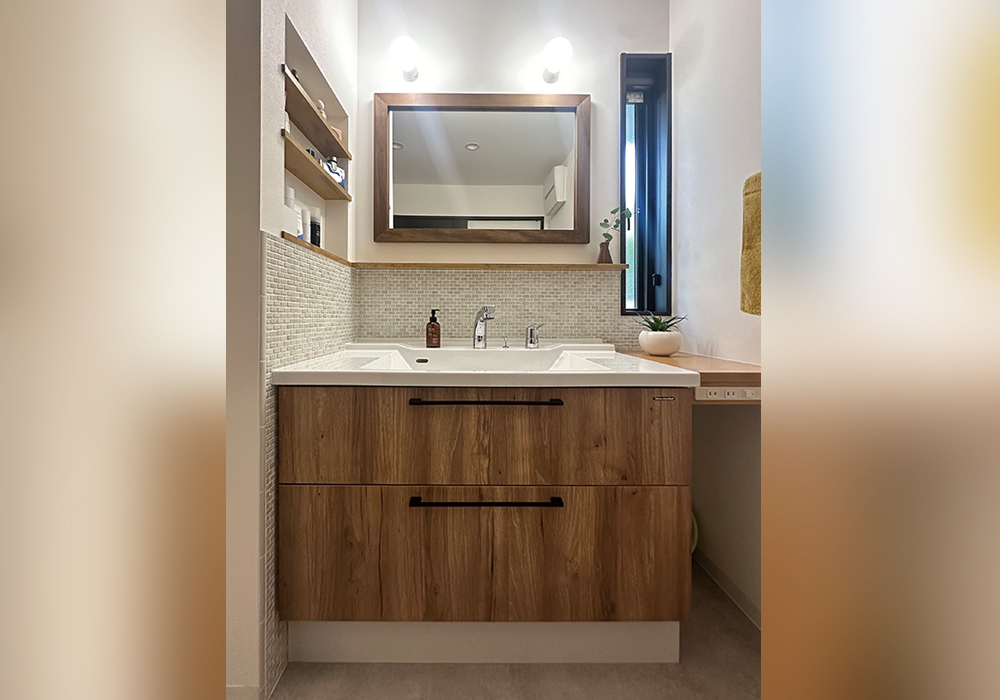 タカラスタンダード「リジャスト」と造作棚、奥様が選んだミラーを組み合わせて素敵な洗面台になりました。